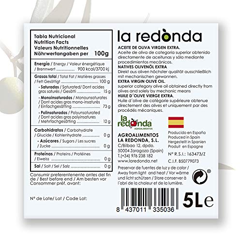 Specificaties: La Redonda extra vierge olijfolie van Arbequina olijven – 5 ltr – slechts één koudgeperst – exclusieve Vroege Oogst op…