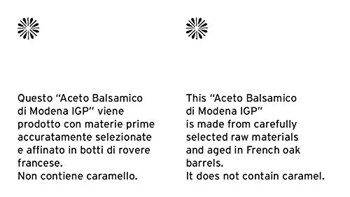 ???? GEEN CHEMICALIN: Balsamico-azijn van Modena BGA verkregen ZONDER: karamel, kleurstoffen, arabicagom, kunstmatige smaakstoffen, toegevoegde sulfieten.