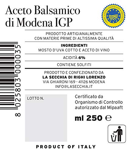 Specificaties: La Secchia – Balsamico Azijn van Modena IGP “Een ster”, Gerijpt in Eiken, Lage Dichtheid, 250 ml Fles met Kurken Doseerdop, Handgemaakte Balsamico Azijn