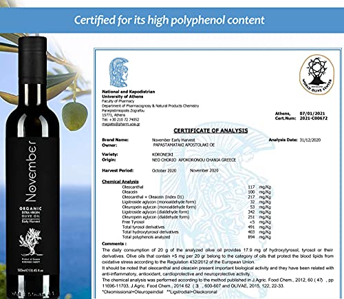 ✅ EARLY HARVEST – 100% ORGANIC EXTRA VIRGIN OLIVE OIL: November Early Harvest is the king of our collection and comprises a totally different product category compared to common extra virgin olive oils. What makes this product so unique is that it is produced under a very advanced set of organic farming methods, so it can achieve the highest possible characteristics in terms of health benefits combined with an ultra-premium taste and aroma. ✅ HIGH PHENOLIC – BENEFICIAL HEALTH EFFECT: By harvesting the olives earlier than the normal practices of the olive oil industry, we produce a limited quantity of olive oil (less juice extracted compared to fully ripened olives), however, the polyphenols content of our Olive Oil is significantly higher (>400mg/kg). Polyphenols are recognised for their antioxidant effect and are beneficial for the Immune System, Cholesterol Regulation, Heart’s health, Inflammations, Brain & Cognitive function. ✅ 100% CERTIFIED AND GLOBALLY AWARDED: November Olive Oil is 100% Organic EU certified pure Olive Oil, BPA Free, Non-GMO, Cold-extracted with No additives, while it is suitable for Vegans. In every harvest year we receive certifications by independent labs certifying both the high quality and the high concentration in polyphenols. November Olive Oil has also received numerous high-quality awards every year at the most prestigious and well-respected international olive oil competitions. ✅ FAMILY GROVES – HAND PICKED – KORONEIKI VARIETY: November is produced by our family Groves in Chania of Crete, Greece, an area that is world famous for its exceptionally good microclimate for the cultivation of high-quality olive oil. November is produced by Koroneiki olive variety, one of the most premium varieties. ✅ SPECIAL BOTTLING TO PRESERVE QUALITY: The bottling of this premium olive oil is of highest quality to protect the oil from sunlight and maintain its power, taste and ingredients for a long time.